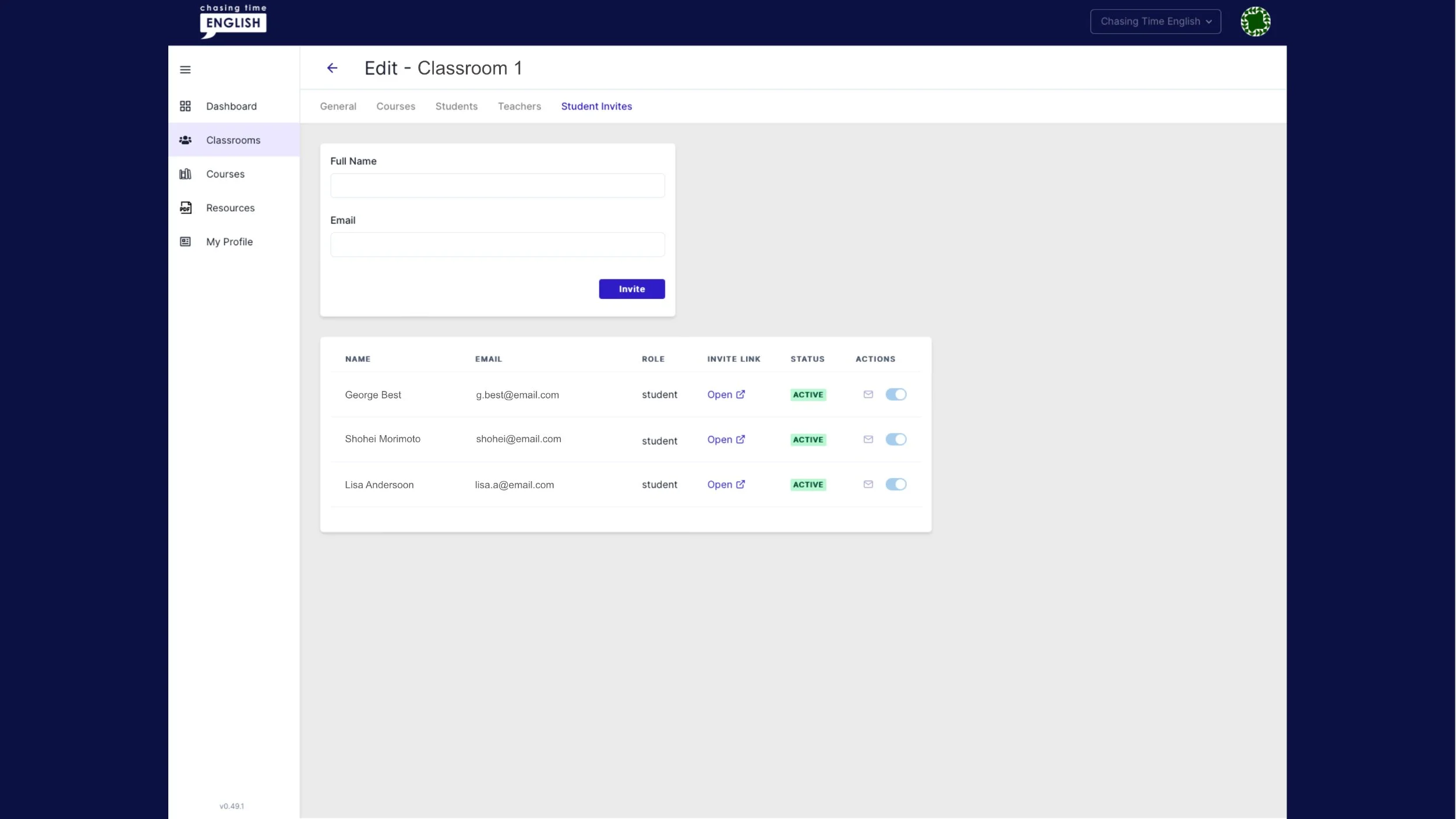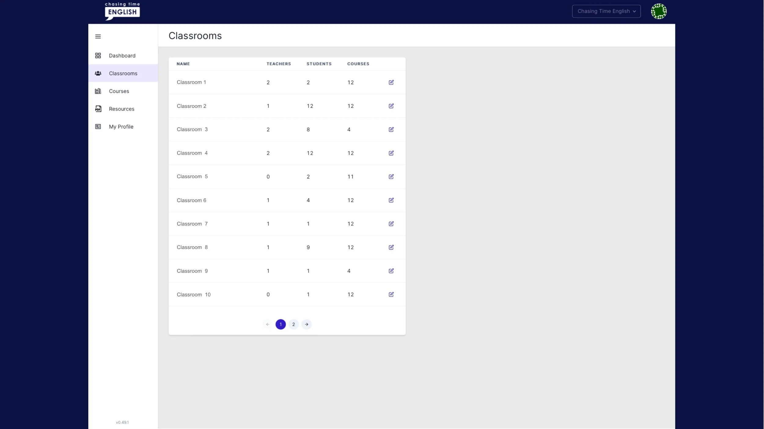 The pen/paper icon on the right-hand side of each classroom gives you access to classroom information, students, and courses.